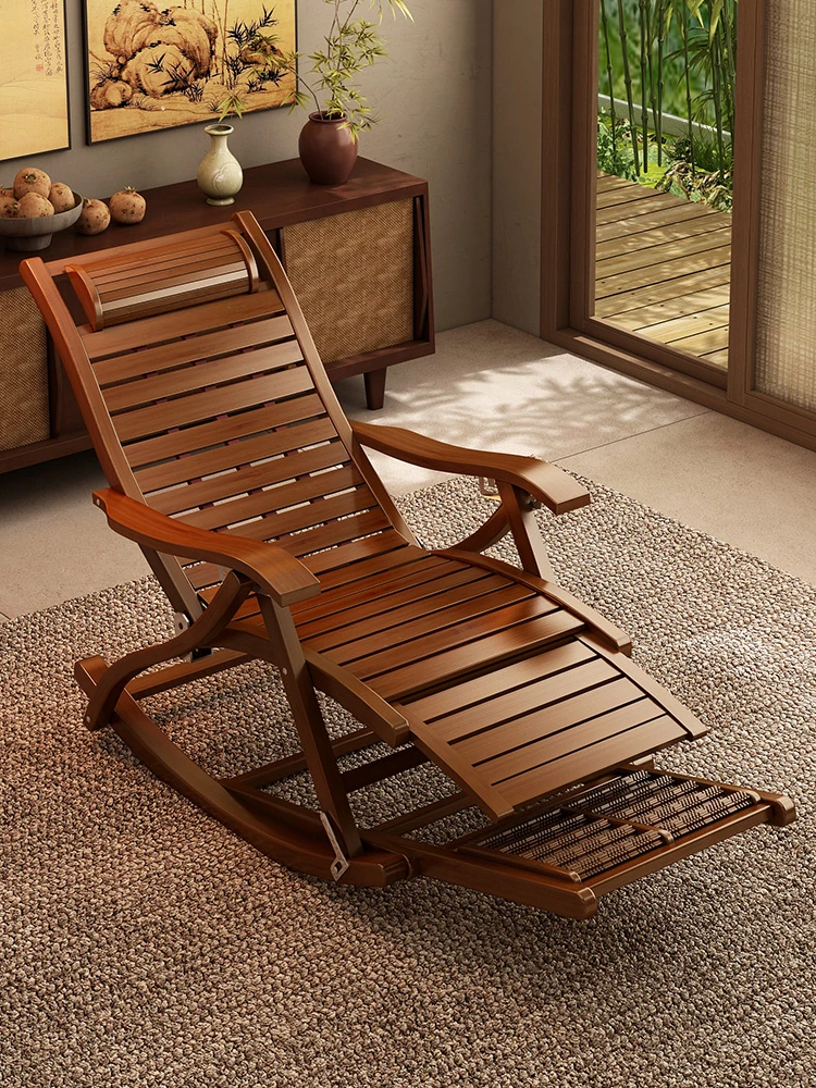 一人用折りたたみ式ロッキングチェア|中華風レトロデザインの昼寝用リクライニングチェア|家庭用バルコニーに最適!夏の涼しさを楽しむ竹製チェアで、快適な昼寝タイムを実現!