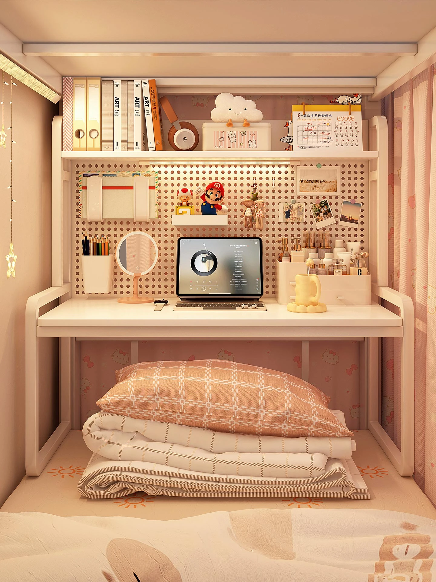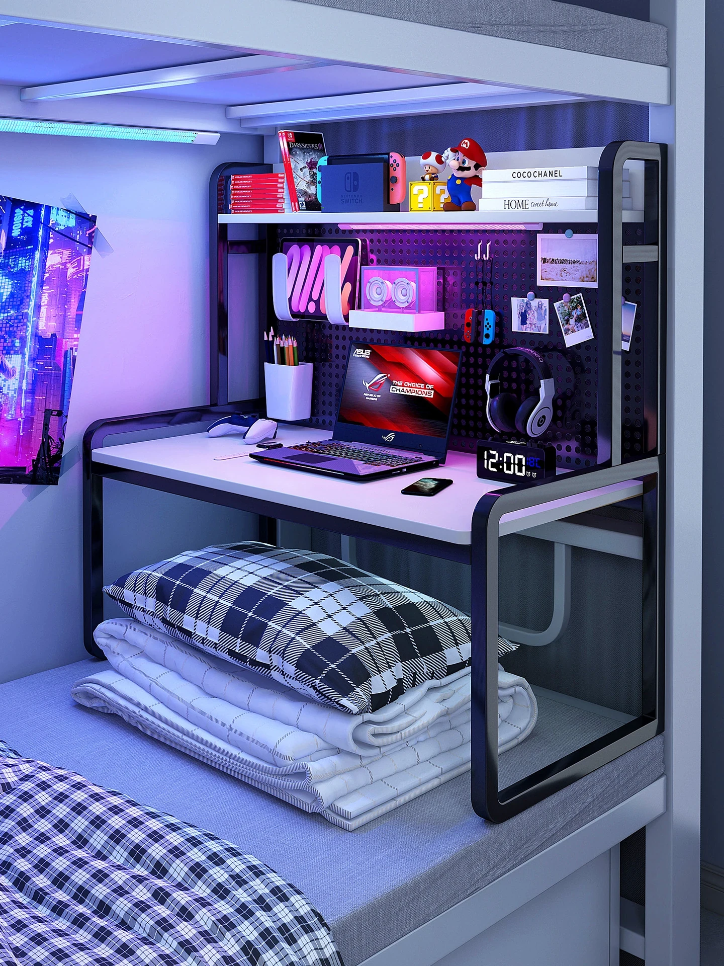 学生向け!多機能デスク - 寮用ベッド上にピッタリのノートパソコンデスク、穴あきボード収納付き!学習や執筆に最適なスタイリッシュなデスクで、効率的な勉強環境を実現!