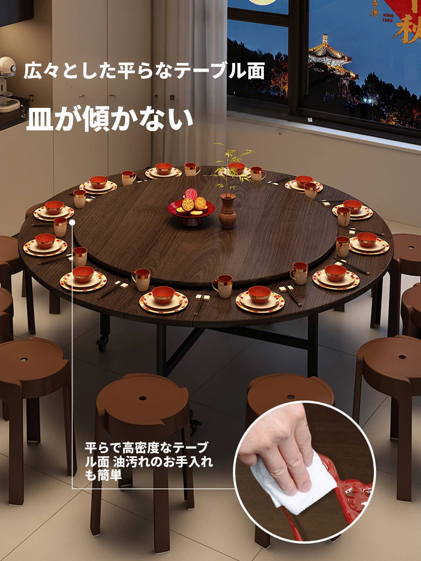 2025年新作!折りたたみ式ダイニングテーブル - 15人用の大きな円形テーブル、回転式プレート付きで小型住宅にも最適!移動も簡単、家族や友人との楽しい食事を演出します。