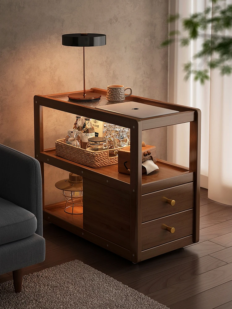 中華風レトロデザインのサイドテーブル、キャスター付きで移動もラクラク!高級感あふれるリビングにぴったりの多機能収納ラック。おしゃれで便利な一体型のソファサイドテーブル。