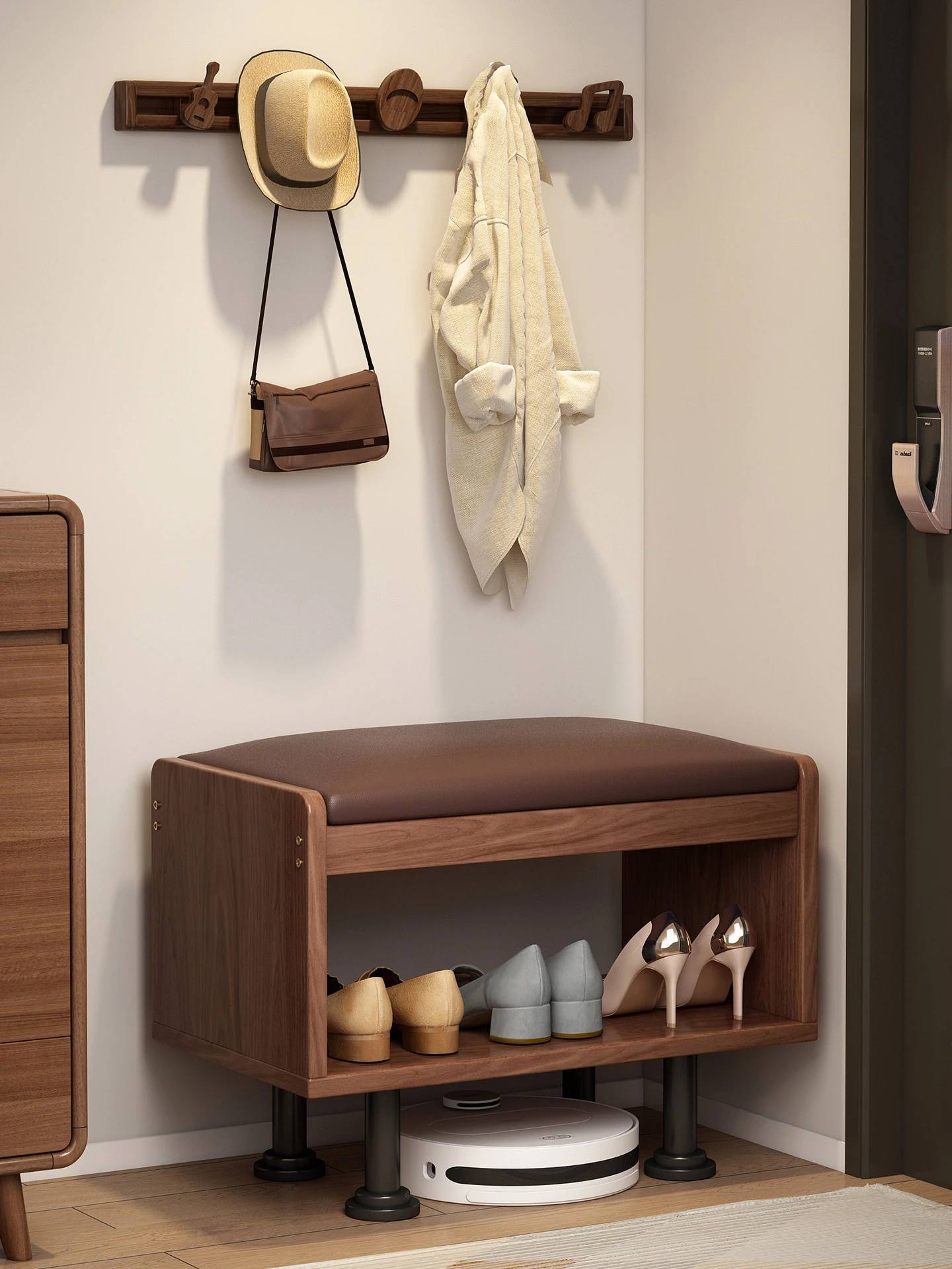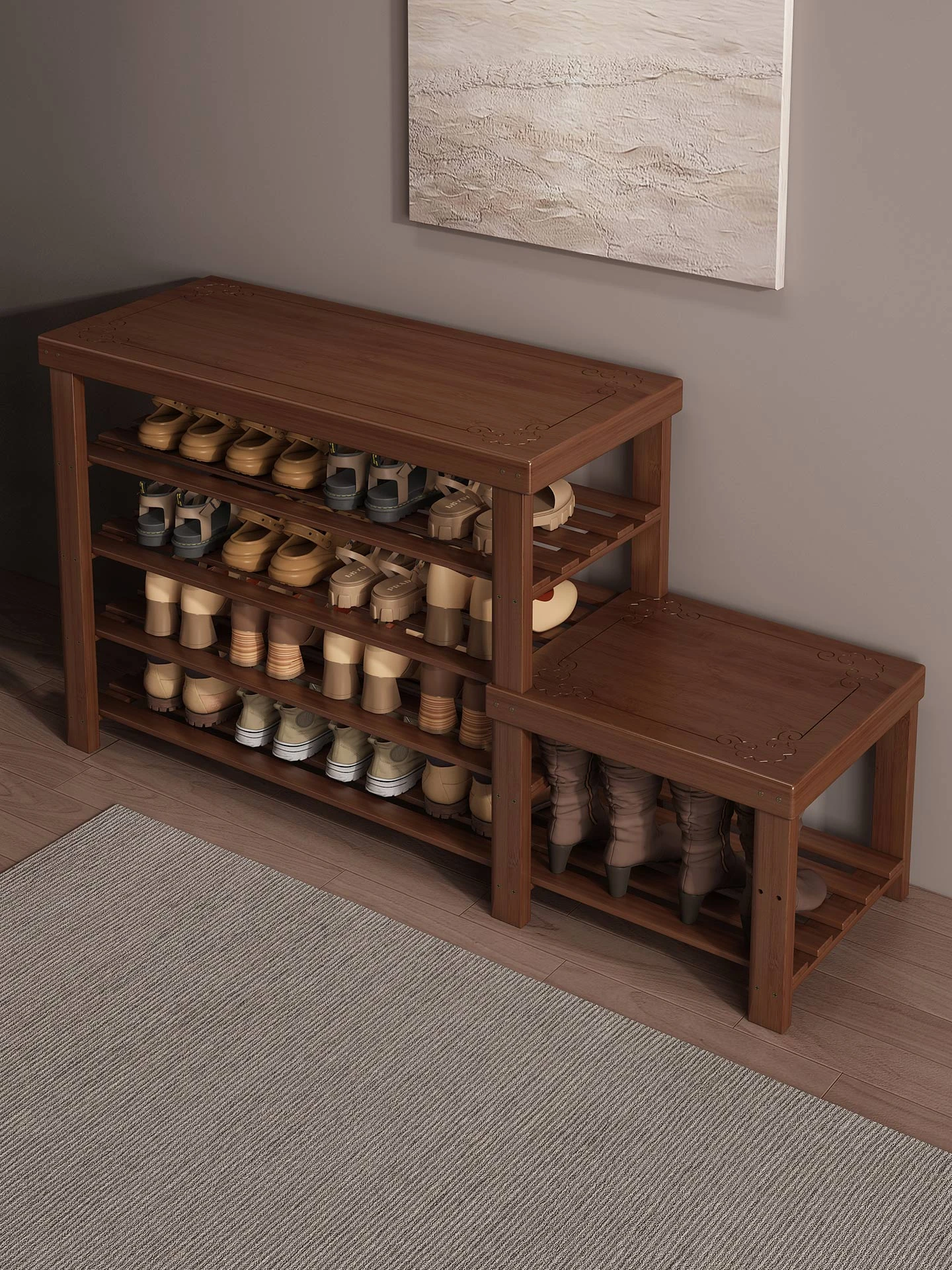四脚バイオニック靴棚 - 無垢材使用・中華風レトロデザイン・家庭用玄関に最適・ロボット掃除機の上に置けるコンパクトな靴ラック!スタイリッシュな収納で、玄関をスッキリ整えましょう!