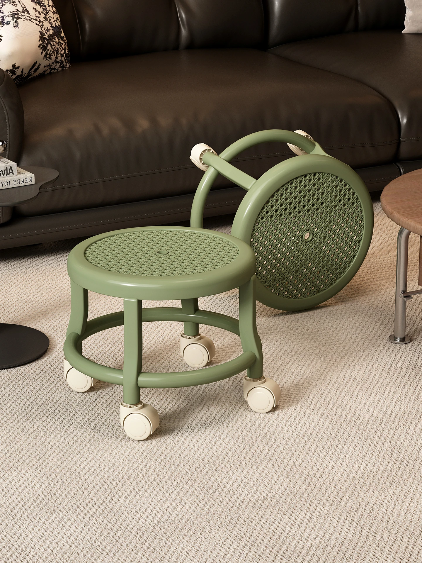キャスター付き小型スツール - 家庭用の便利なロータイプチェア。移動が簡単なリビング用の快適な座椅子。宅配便の受け取りやちょっとした休憩に最適な、背もたれ付きのスライド式スツールです!