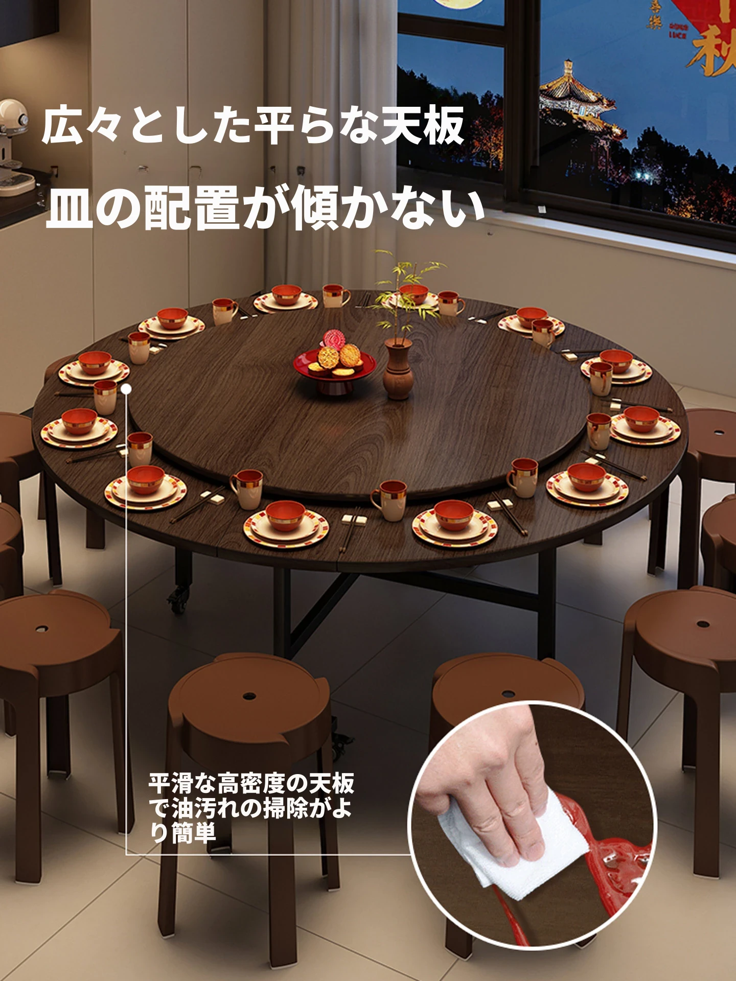 折りたたみ式円形ダイニングテーブル10人用|移動可能な多機能テーブル|回転式プレート付き|2025年新作で、家族や友人との楽しい食事タイムを演出!
